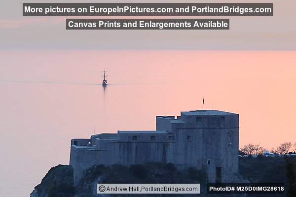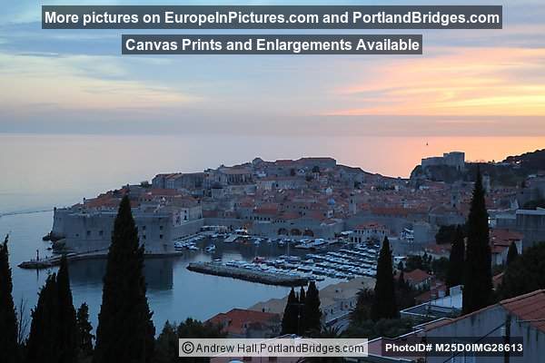 Back in 2009, I had found a nice spot above the old town – quite a hike up steps and hills – to photograph Dubrovnik at sunset, with the ocean behind it. I was tempted to find it again, but if the clouds rolled in, would it be worth it? (There’s also a funicular now that takes you up the mountain – something not yet running on my previous trip – but the funicular stopped running just after sunset, and I didn’t care to hike all the way down at night.) I hesitated, then finally decided to try to hike up and find that spot. I huffed and puffed and hiked up many stairs through neighborhoods, trying to remember – where WAS this spot? I should have left earlier…