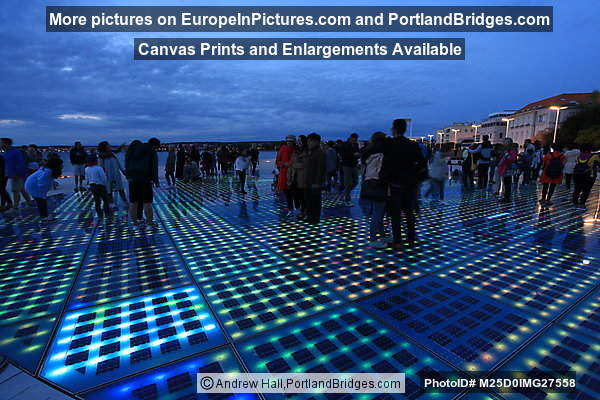 At the northwest corner of the peninsula (the top) are the sea organ – a cool natural musical instrument built right into the promenade, with the wind blowing into the “organ” to make notes – and the “Sun Salutation” – a cheesy-but-fun disc about 20 feet in diameter made up of what look like solar panels. The panels collect energy during the day, and at night they light up in different colors, as people walk on it and pose for selfies. It’s a fun tourist attraction (especially for kids) but not the sort of thing most tourists might come to Croatia for.
